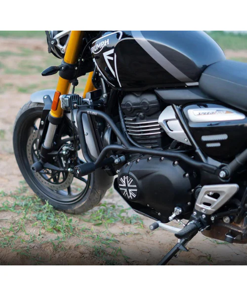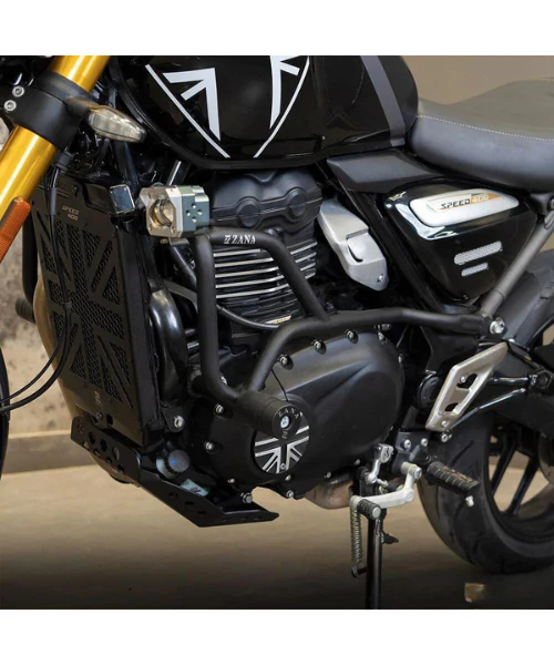 Crash Guard for Triumph Speed 400 features 3-point mounting for maximum rigidity, round sliders for protection and comfort, cold-rolled powder-coated steel, rust-free hardware, and fog light compatibility